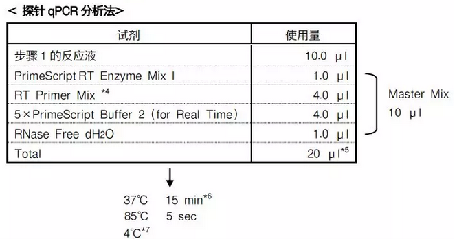 在反转录反应中,TB Green qPCR 法的 RT Primer Mix 用量为 1 μl, 探针 qPCR分析法的用量为 4 μl。